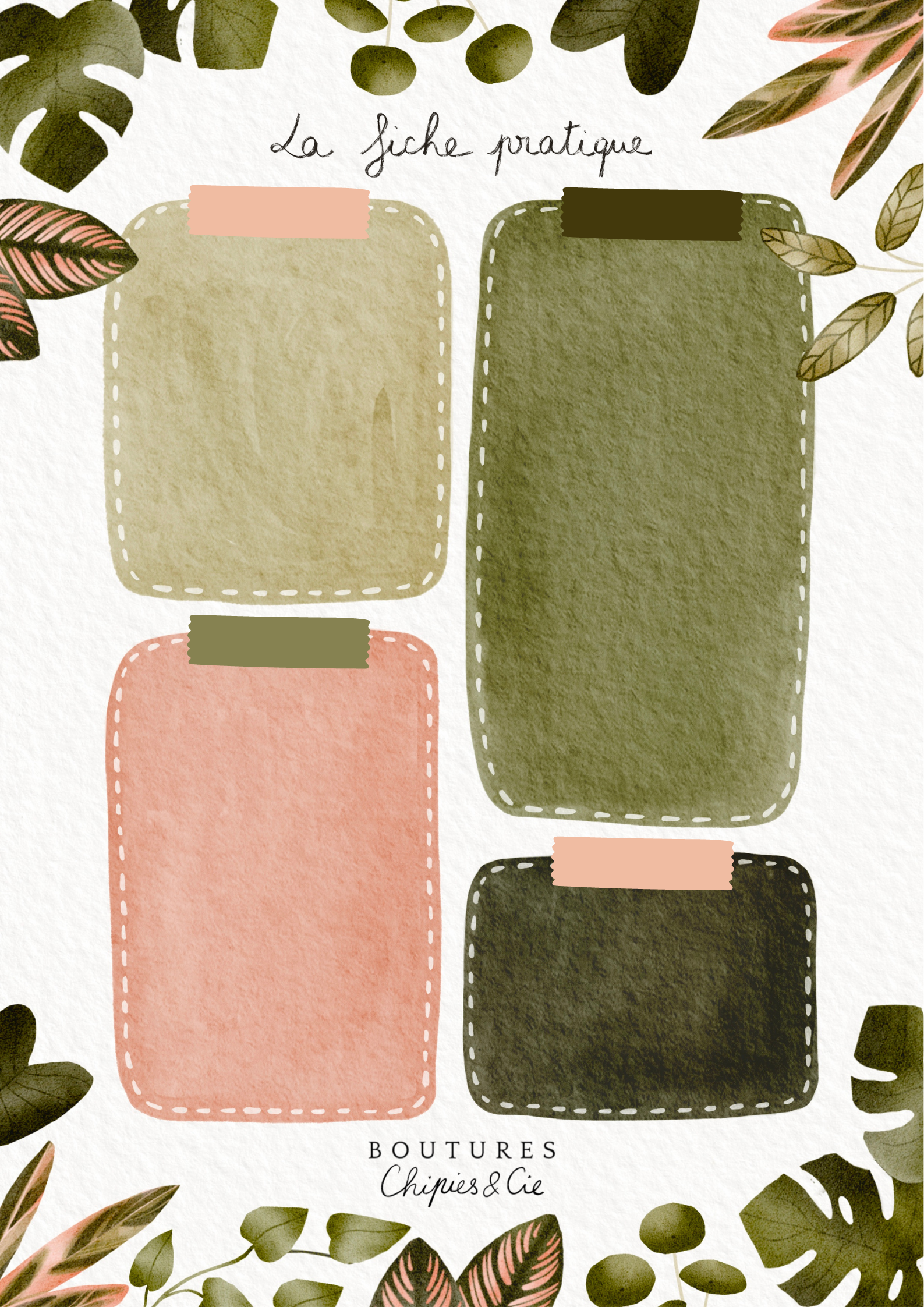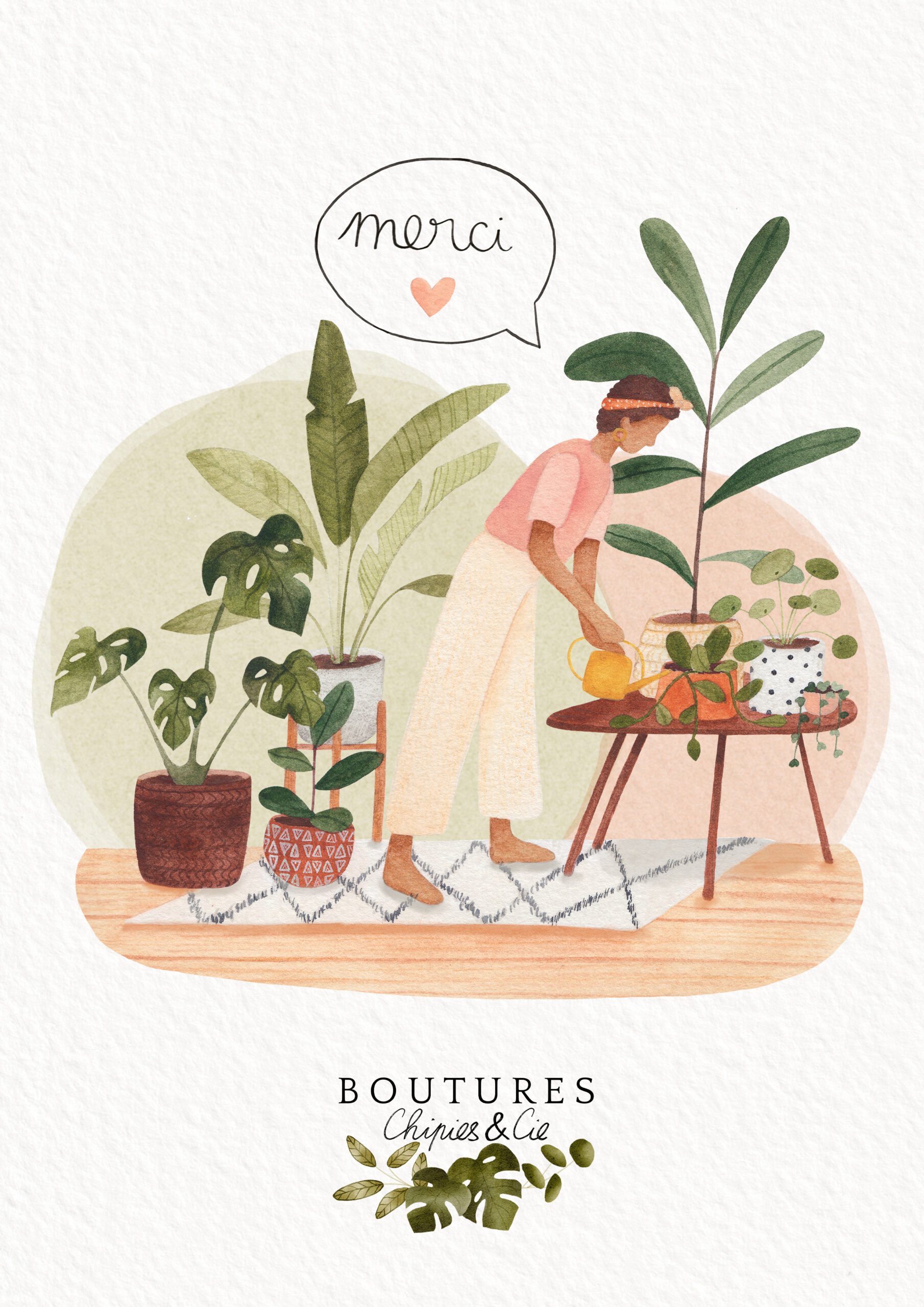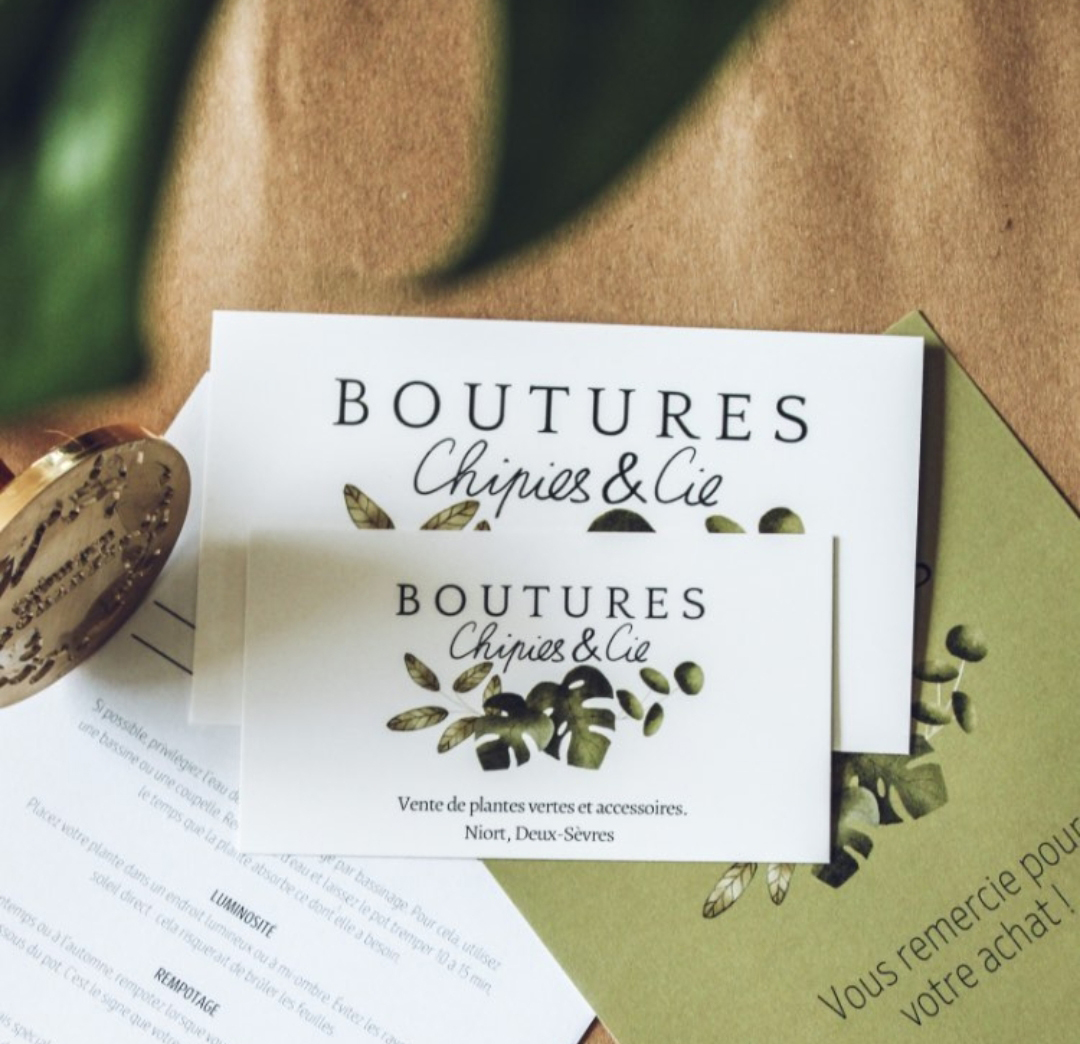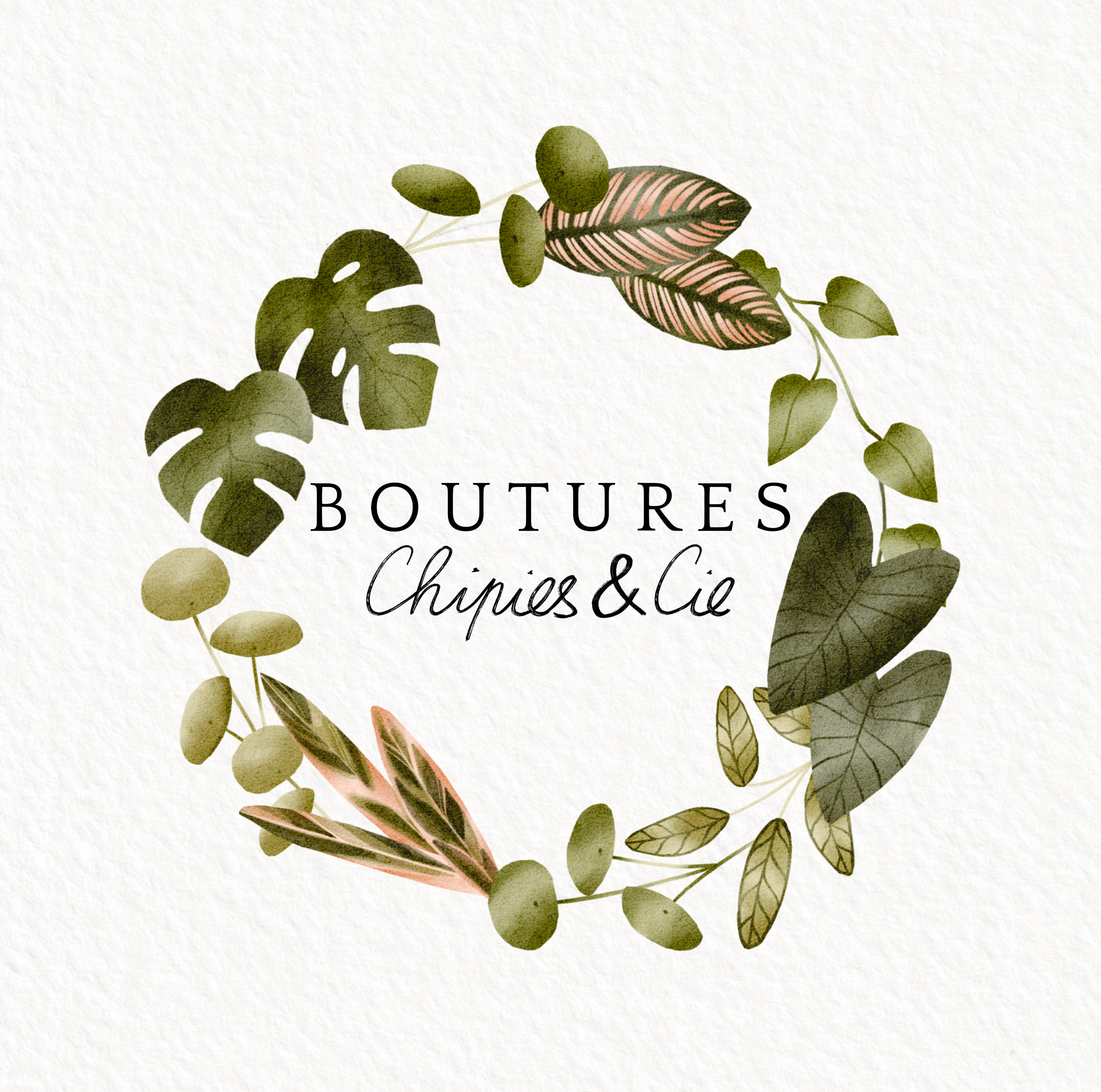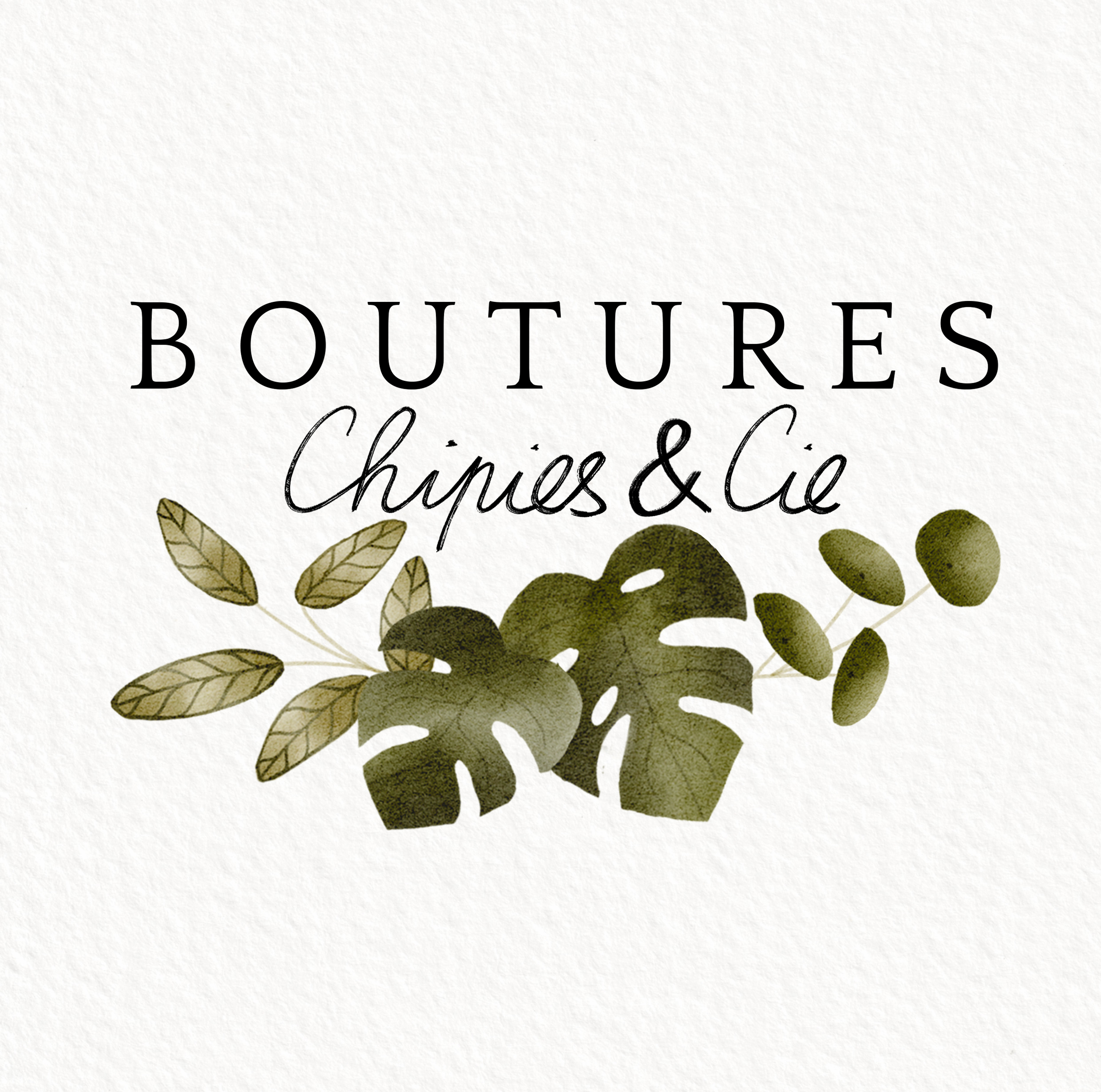 Réalisation du logo et de ses déclinaisons ainsi que de visuels de communication (carte de remerciements, fiche explicative) pour Boutures Chipies & Cie, un shop en ligne de plantes, accessoires et bougies.