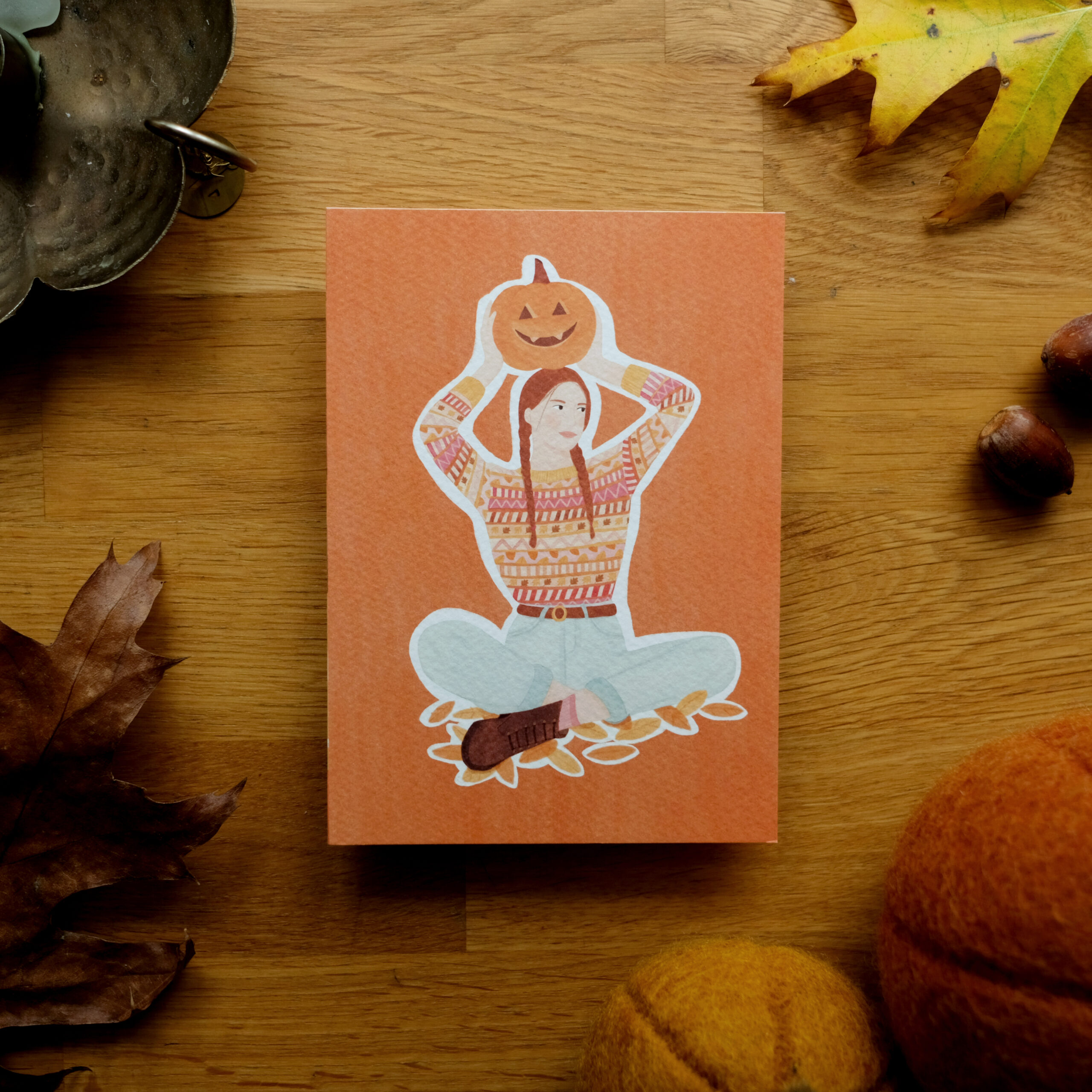 Carte illustrée ‘Pumpkin Girl’, pour se mettre dans l’ambiance d’Halloween. Imprimée et découpée à la main dans mon atelier.
